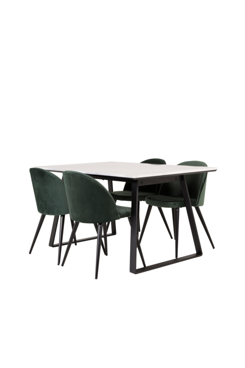 Estri matbord med en bordsskiva i marmor och bordsben i metall. Matchas med 4st Valleta matstolar. Matbordets mått: Längd: 140, Bredd: 90, Höjd: 74,5. Stolens mått: Sitthöjd: 46,5, Sittbredd: 41, Sittdjup: 42,5. Bord och matstolar kräver enklare montering.