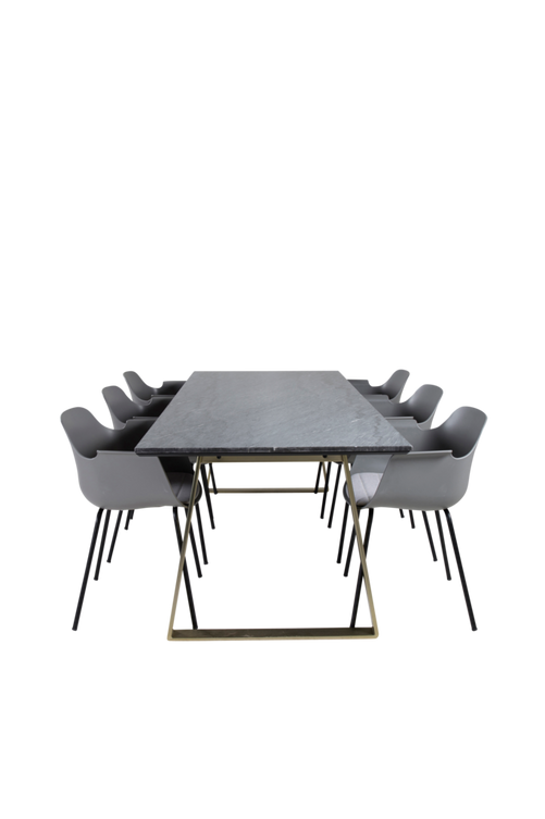 Estri matbord med en topp i marmor och bordsben i metall . Matchas med 6st Catrine matstolar med stolsits i plast och stolsben i metall. Bord och stol kräver enklare montering. Bordets mått: Längd: 200cm, Bredd: 90cm, Höjd: 76cm. Stolens mått: Sittdjup: 42cm, Sittbredd: 39cm, Sitthöjd: 45cm.