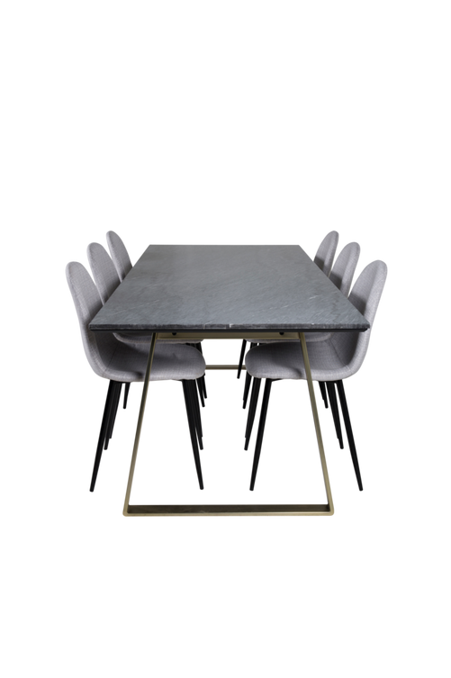 Estri matbord med en topp i marmor och bordsben i metall . Matchas med 6st Penally matstolar med stolsits i polyester och stolsben i metall. Bord och stol kräver enklare montering. Bordets mått: Längd: 200cm, Bredd: 90cm, Höjd: 76cm. Stolens mått: Sittdjup: 39,5cm, Sittbredd: 41cm, Sitthöjd: 45,5cm.