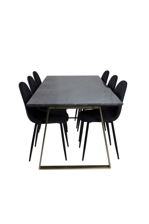 Estri matbord med en topp i marmor och bordsben i metall . Matchas med 6st Penally matstolar med stolsits i sammet och stolsben i metall. Bord och stol kräver enklare montering. Bordets mått: Längd: 200cm, Bredd: 90cm, Höjd: 76cm. Stolens mått: Sittdjup: 39cm, Sittbredd: 44cm, Sitthöjd: 41,5cm.