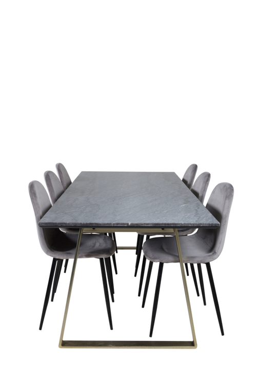 Estri matbord med en topp i marmor och bordsben i metall . Matchas med 6st Penally matstolar med stolsits i sammet och stolsben i metall. Bord och stol kräver enklare montering. Bordets mått: Längd: 200cm, Bredd: 90cm, Höjd: 76cm. Stolens mått: Sittdjup: 39cm, Sittbredd: 44cm, Sitthöjd: 41,5cm.