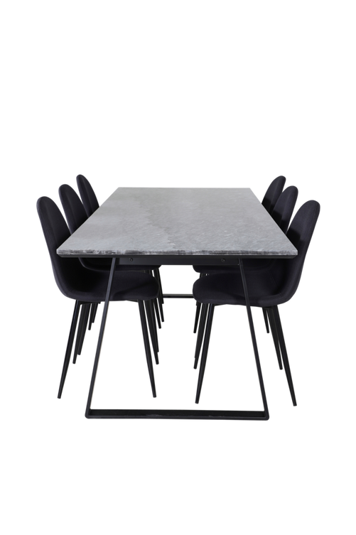 Estri matbord med en topp i marmor och bordsben i metall . Matchas med 6st Penally matstolar med stolsits i sammet och stolsben i metall. Bord och stol kräver enklare montering. Bordets mått: Längd: 200cm, Bredd: 90cm, Höjd: 76cm. Stolens mått: Sittdjup: 39cm, Sittbredd: 44cm, Sitthöjd: 41,5cm.