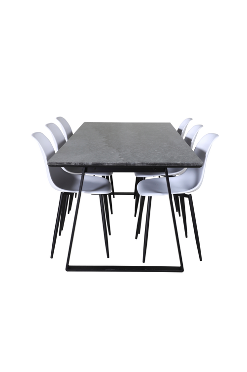 Estri matbord med en topp i marmor och bordsben i metall . Matchas med 6st Penally matstolar med stolsits i sammet och stolsben i metall. Bord och stol kräver enklare montering. Bordets mått: Längd: 200cm, Bredd: 90cm, Höjd: 76cm. Stolens mått: Sittdjup: 39cm, Sittbredd: 44cm, Sitthöjd: 41,5cm.