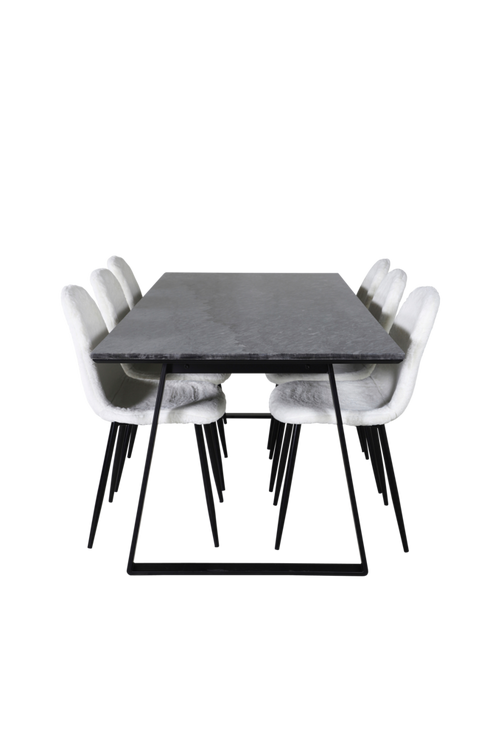 Estri matbord med en topp i marmor och bordsben i metall. Matchas med 6st Penally matstolar med stolsits i teddy polyester och stolsben i metall. Bord och stol kräver enklare montering. Bordets mått: Längd: 200cm, Bredd: 90cm, Höjd: 76cm. Stolens mått: Sittdjup: 39,5cm, Sittbredd: 41cm, Sitthöjd: 45,5cm.