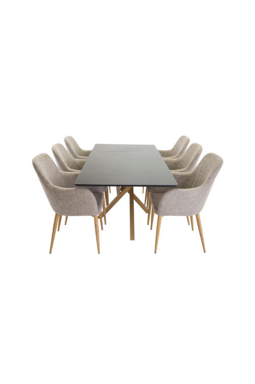 Plaza matgrupp med ett modernt matbord med en svart läcker MDF topp och ekfärgade bordsben i metall. Bordets mått: Längd: 180cm. Bredd: 90cm. Höjd: 75cm. Matchas med sex stycken eleganta matstolar. Mått stol: Bredd: 50cm. Höjd: 92cm. Djup: 45cm. Sitthöjd: 48.5cm. Bordet och stolarna kräver enklare montering.