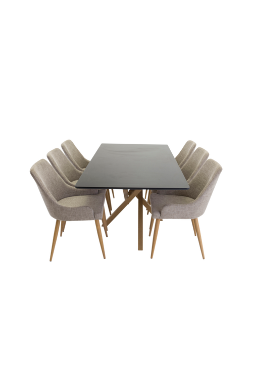 Plaza matgrupp med ett modernt matbord med en svart läcker MDF topp och ekfärgade bordsben i metall. Bordets mått: Längd: 180cm. Bredd: 90cm. Höjd: 75cm. Matchas med sex stycken tjusiga matstolar. Mått stol: Bredd: 34cm. Höjd: 86cm. Djup: 46cm. Sitthöjd: 46.7cm. Bordet och stolarna kräver enklare montering.
