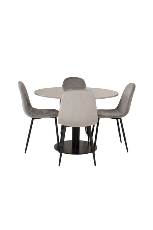 Ruben matbord med en rund topp i terazzo och bordsben i metall. Bordets mått: Diameter: 106cm, Höjd: 75cm. Matchas med 4st Penally matstolar i sammet och stolsben i metall. Stolens mått: Totalhöjd: 88cm, Bredd: 42,5cm, Djup: 53,3cm, Sitthöjd: 41,5cm. Bord och stol kräver enklare montering.