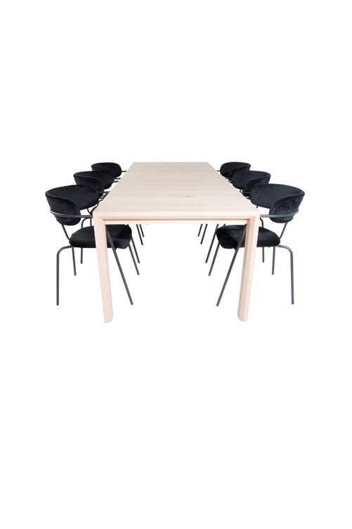 Sandhamn förlängningsbart matbord (förlängningsbart till 250 cm) med en topp i ekfanér med spånskiva och bordsben i ek. Matchas med 6st Atticus matstolar med stolsits i polyester och stolsben i metall. Bordets mått: Längd: 170cm, Bredd: 95cm, Höjd: 75cm. Stolens mått: Sittdjup: 43,5cm, Sittbredd: 47cm, Sitthöjd: 47cm.