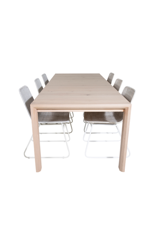 Sandhamn förlängningsbart matbord (förlängningsbart till 250 cm) med en topp i ekfanér med spånskiva och bordsben i ek. Matchas med 6st Camille matstolar med stolsits i rotting och stolsben i metall. Bordets mått: Längd: 170cm, Bredd: 95cm, Höjd: 75cm. Stolens mått: Sittdjup: 59cm, Sittbredd: 48cm, Sitthöjd: 45cm.