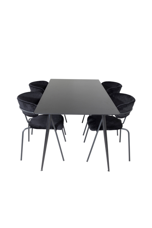 Solhem matbord med en bordstopp i MDF och bordsben i metall. Matchas med 4st Atticus matstolar med stolsits i sammet och stolsben i metall. Bord och stol kräver enklare montering.
