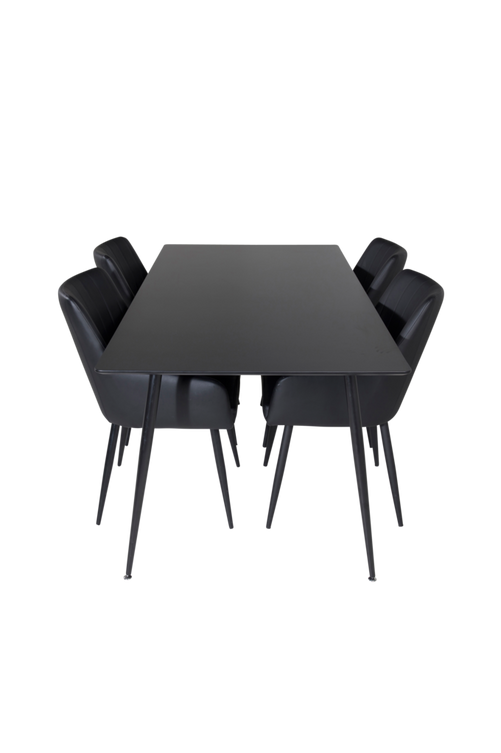 Solhem matbord med en bordstopp i MDF och bordsben i metall. Matchas med 4st Catrine matstolar med stolsits i konstläder och stolsben i metall. Bord och stol kräver enklare montering.
