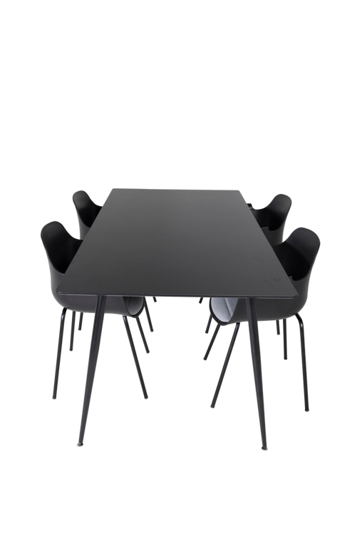 Solhem matbord med en bordstopp i MDF och bordsben i metall. Matchas med 4st Catrine matstolar i plast med stolsben i metall. Bord och stol kräver enklare montering.