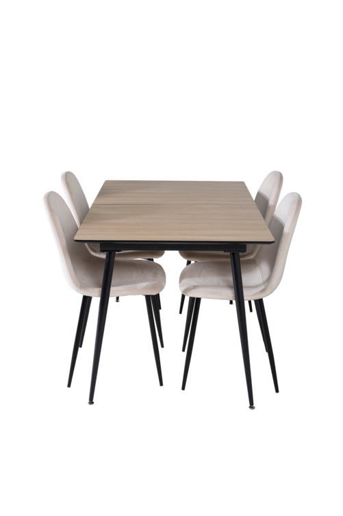 Solhem förlängingsbart matbord med en topp i MDF och bordsben i metall. Matchas med 4st Penally matstolar med stolsits i sammet och stolsben i metall. Bord och stol kräver enklare montering.