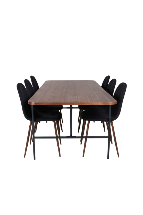 Uno matbord med en bordstopp i MDF med faner och bordsben i metall. Matchas med 6 st Polar matstolar med stolsits i polyester och stolsben i metall. Bord och stol kräver enklare montering. Bordets mått: Längd: 200 cm, bredd: 90 cm, höjd: 74 cm. Stolens mått: Sittdjup: 39,5 cm, sittbredd: 41 cm, sitthöjd: 45,5 cm.