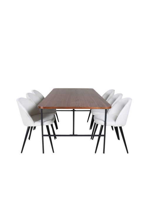 Uno matbord med en bordstopp i MDF med faner och bordsben i metall. Matchas med 6 st Velvet matstolar med stolsits i manchester och stolsben i metall. Bord och stol kräver enklare montering. Bordets mått: Längd: 200 cm, bredd: 90 cm, höjd: 74 cm. Stolens mått: Sittdjup: 42,5 cm, sittbredd: 41 cm, sitthöjd: 46,5 cm.