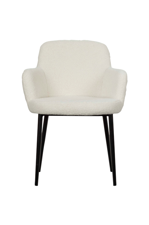 Bekväm matsalsstol med enkel design Metallstomme med svart finish Klädd med mjukt teddytyg i offwhite färg H 83 cm x B 62 cm x D 53 cm Med Dining matsalsstol får du en snygg och bekväm stol i matgruppen. Dining matsalsstol ingår i en kollektion från det nederländska märket vtwonen och har en elegant och stilren design. Sitsen och armstöden är klädda med ett högkvalitativt teddytyg (100% polyester) i tidlös offwhite färg. Stommen är tillverkad av matt, svart, pulverlackerade metall. Dining matsalsstol tål en maximal belastning på 120 kg och väger drygt 9 kg. Stolen Dining är 83 cm hög, 62 cm bred och 53 cm djup. Sitthöjden är 52 cm. Sitsen är 44 cm hög och 45 cm djup. Ryggstödet mäter 36 cm ovanför sitsen. Armstöden är anslutna till ryggstödet och är 18 cm högre än sitsen, vilket ger en bekväm och säker sittposition. Benen är 43 cm höga, med en diameter på 3 cm högst upp och 2 cm längst ner. För att skydda hårda golv, sätt möbeltassar av filt under benen. Detta förhindrar repor. Teddytyget på sitsen och armstöden är lätt att hålla rent med en möbelborste. För att ta bort fläckar, badda med en lätt fuktad trasa.