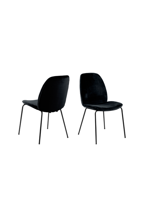 Matstol Cara säljs i 2 pack. Pulverlackade metallben. Stoppad sits klädd i 100% sammetspolyester. Höjd 87,5 cm, bredd 48,5 cm, djup 63 cm. Sitthöjd 87 cm. Levereras omonterad.