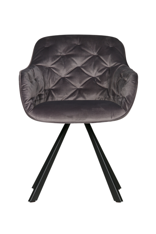 Elaine matstol är en elegant matstol med en sittdel inredd i ett underbart sammetstyg (100% polyester). Armstöd och ryggstöd har en djupknappad struktur. Benen är gjorda i metall. Mått: höjd 80,5 cm, bredd på 59,5 cm och ett djup på 59 cm. Sitsens höjd är 49 cm, sittdjupet är 42 cm och sittbredden 44 cm. Benens höjd är 38 cm.