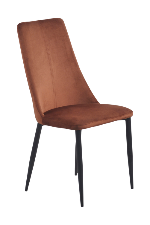 Matstol i velour med lackerade metallben. Snygg söm i ryggdelen. Ligger 4-pack. Levereras omonterade.