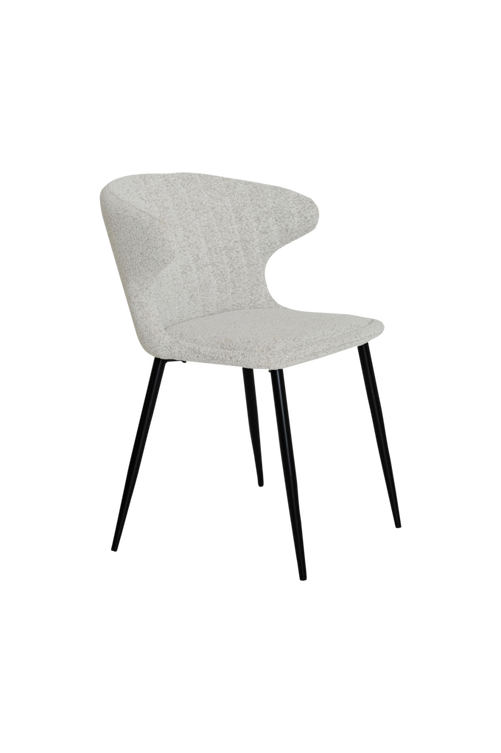 Matstol i boucletyg med ben i lackad metall. Ligger förpackade 2 st i en kartong. levereras omonterade.