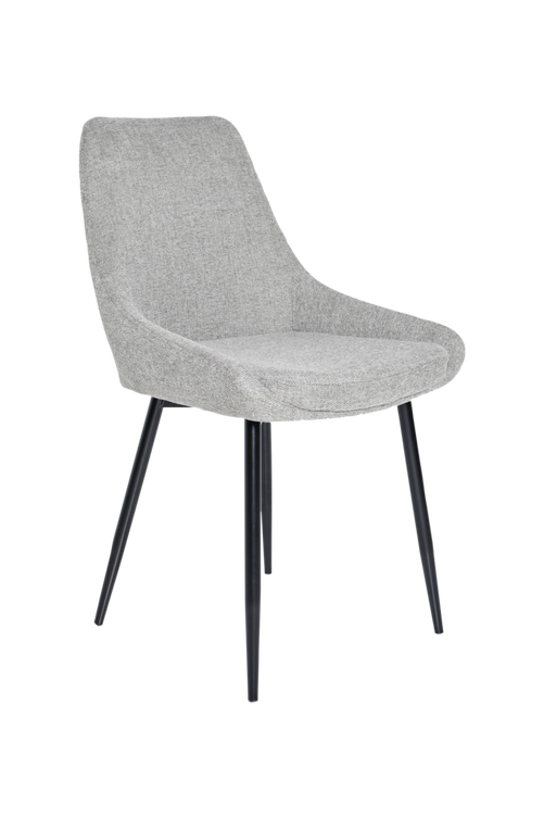 Matstol i tyg med ben i lackad metall. Ligger förpackade 4 st i en kartong. Bredd 49,5 cm, djup 56 cm och höjd 86 cm. Omonterade.