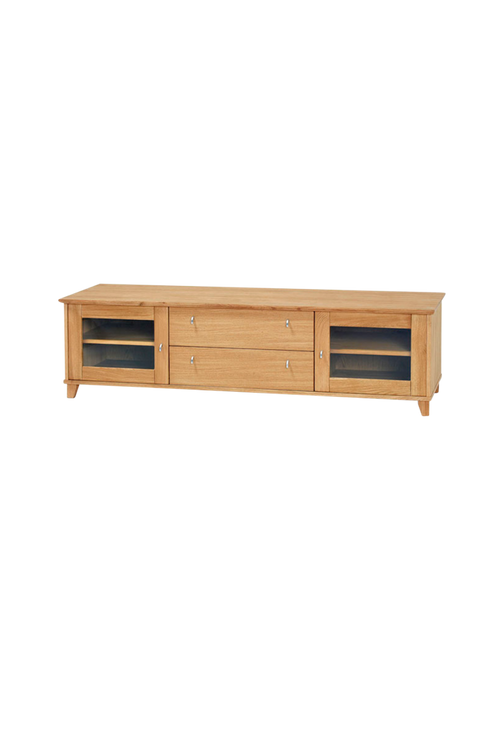 Mediabänk med 2 st lådor och 2 glasdörrar. Bredd 180 cm. Djup 50 cm. Höjd 55 cm. Vikt 57 kg. Monterad