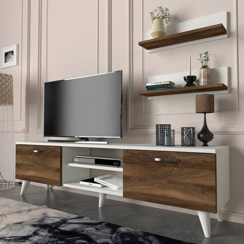Material: 100% Melaminbelagd spånskiva TV Bänk: Mått: 150 x 40,6 x 30 cm Hylla Mått: 50 x 15 x 12 cm (2ts)