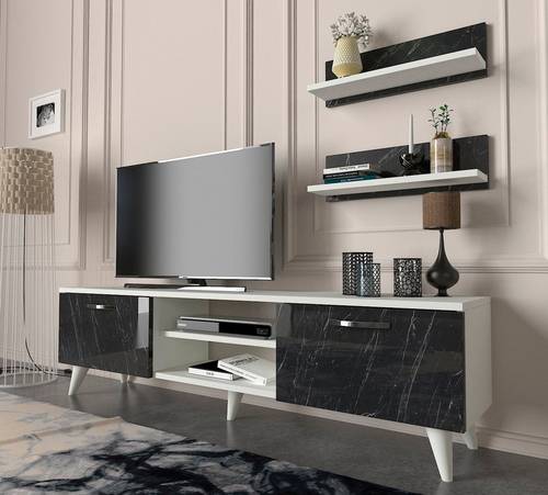 Material: 100% Melaminbelagd spånskiva TV Bänk: Mått: 150 x 40,6 x 30 cm Hylla Mått: 50 x 15 x 12 cm (2ts)