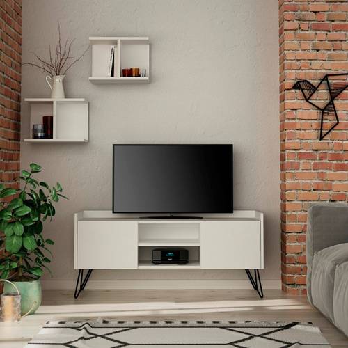 Material: 100% Melaminbelagd spånskiva Metallben TV Bänk: Mått: 125,5 x 56,5 x 33 cm Vägghylla Mått: 40 x 30 x 22 cm (2ts)