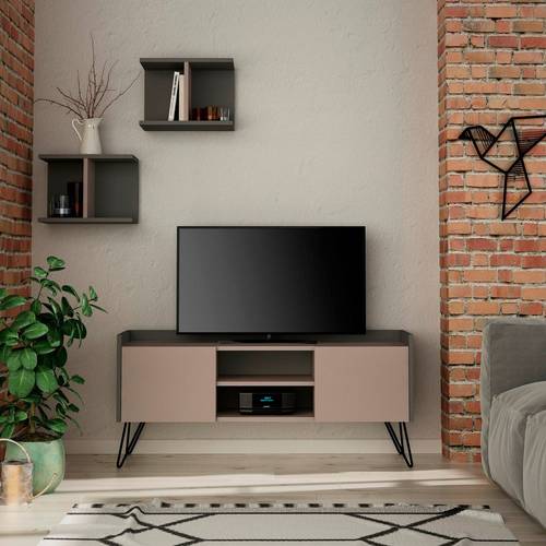 Material: 100% Melaminbelagd spånskiva Metallben TV Bänk: Mått: 125,5 x 56,5 x 33 cm Vägghylla Mått: 40 x 30 x 22 cm (2ts)