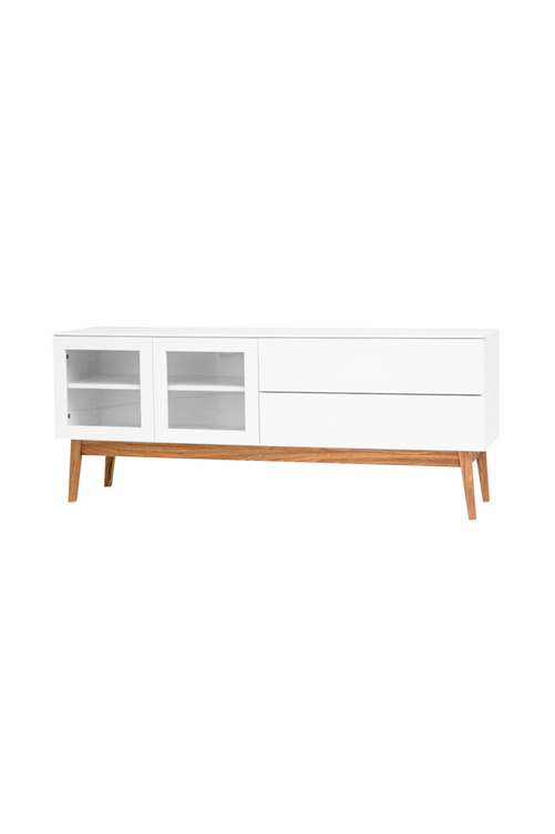 Mediabänk i vitt med underrede i massiv oljad ek. 2 glasdörrar och 2 lådor. Bredd 160 cm. Djup 40 cm. Höjd 64 cm. Vikt 42 kg.