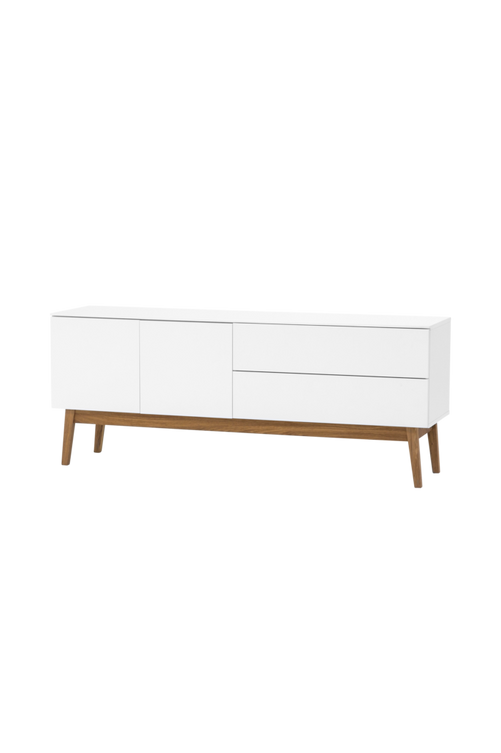 Mediabänk i vitt med underrede i massiv oljad ek. 2 trädörrar och 2 lådor. Bredd 160 cm. Djup 40 cm. Höjd 64 cm. Vikt 45 kg.