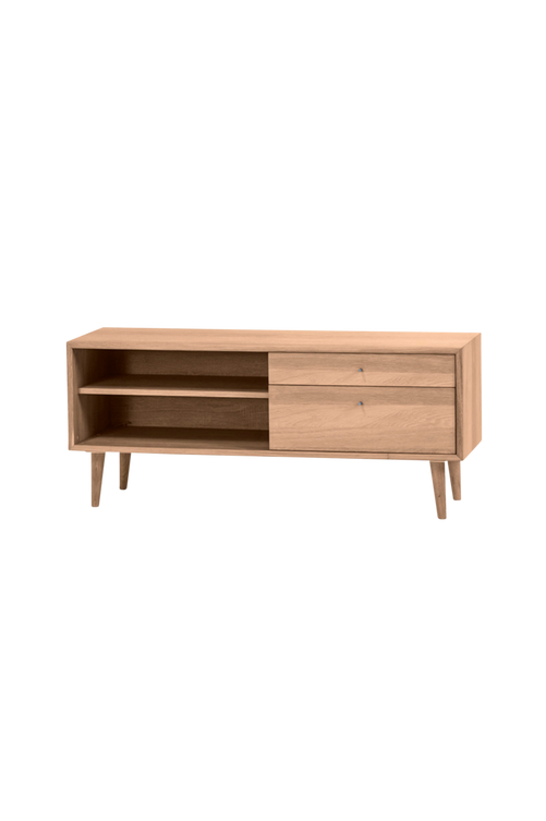 Mediabänk i oljad ek med 2 lådor. Bredd 118 cm. Djup 39 cm. Höjd 50 cm. Vikt 25 kg.