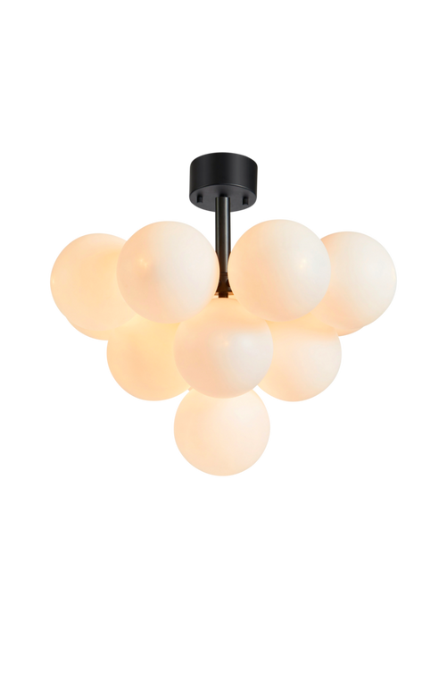 Vacker plafond med stomme av svart metall. Med sina 13 dekorativa glasglober blir MERLOT ett riktigt konstverk i ditt vardagsrum. Hängs upp med takkrok. Material: Glas och textil. Storlek: Höjd 52 cm, ø 56 cm. Sockel/lampa: 13 st G9, max 20 w glödlampa eller motsvarande LED. Ljuskälla medföljer ej. Takkontakt ingår ej på grund av ett nytt EU-direktiv. Takkontakter finns att beställa separat.