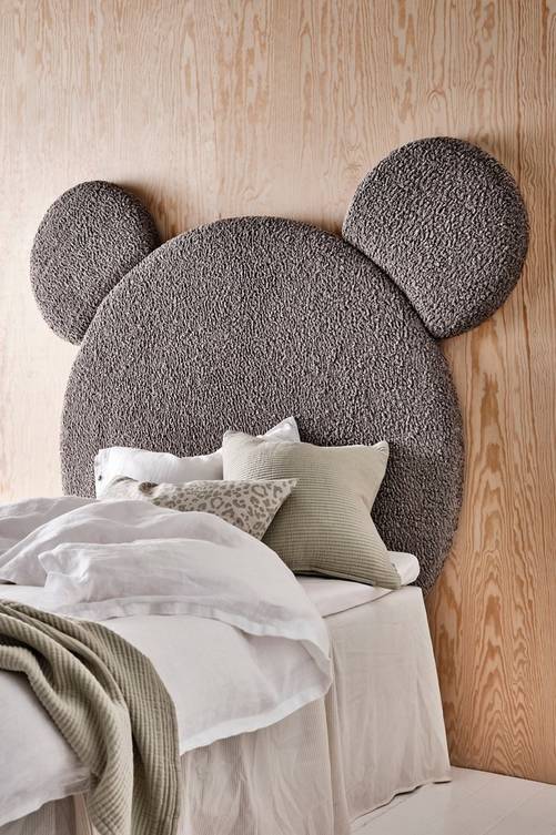 Vägghängd sänggavel i mjuk teddy med stomme av plywood och mjuk skumfyllning av polyuretan. MIKKE har en lekfull rund design med söta öron upptill. Sänggaveln monteras mot väggen bakom din resårmadrass. Väggfästen medföljer. Sänggaveln går även att ställa mellan vägg och säng för att slippa monteras. Material: 100% polyester, plywood och skumfyllning. Storlek: Bredd 147 cm, höjd 115 cm, djup 5 cm. Skötselråd: Dammsugning.