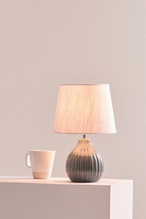 Bordslampa med fot av keramik och skärm av linne. Foten är mjukt rundad med lodräta reliefränder och vacker glasyr. Den släta linneskärmen ger en stilren känsla. Skärmen har metallstomme. Material: Keramik, linne och metall. Storlek: Total höjd 34 cm. Fot: ø 14 cm, höjd 17 cm. Skärm: ø 21,5 cm, höjd 16,5 cm. Sockel/lampa: 1 st E14, max 40 w. Ljuskälla medföljer ej. Tips/råd: Lin är ett fint material och snyggt att följa upp i andra textilier i rummet.