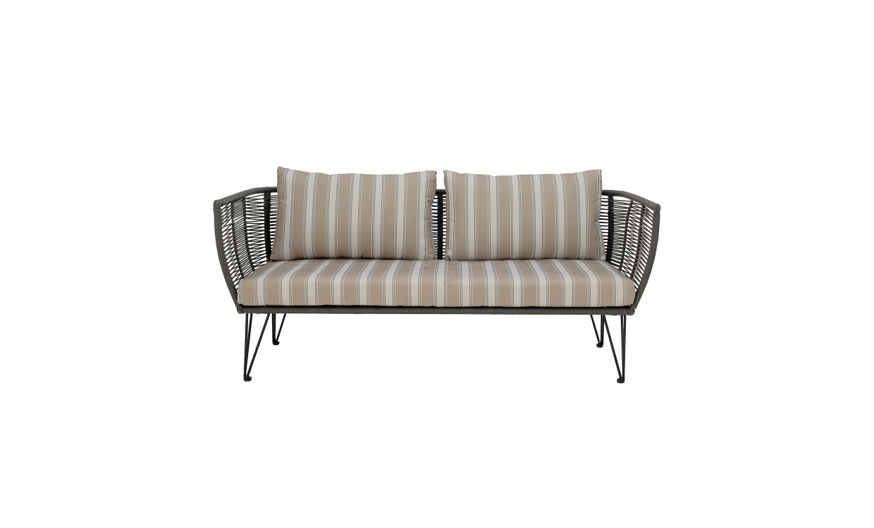 Mundo är snygg och skön soffa för både inom- och utomhusbruk från Bloomingville. En svart metallram kombinerad med handvävt rep i polyester ger en industriell och modern look. För extra komfort tillkommer dessutom ett gäng randiga kuddar. Mundo ger din balkong, uteplats eller vardagsrum ett helt nytt liv.Design & egenskaperSnygg soffa för både inom- och utomhusbruk.Har måtten: 175x72x74 cm.Går att montera isär.Material & skötselTillverkad i metall.Metallramen tål frost och repen är vattenavvisande. Dynorna är i polyester.Tvättråd dynor: Maskintvätt 30°, torktumling samt strykning på låg värme.