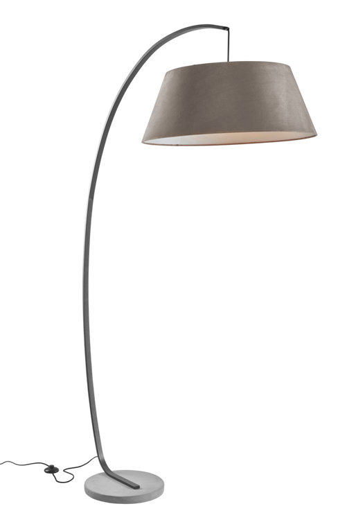 Modern golvlampa med böjd form. Fot av cement, ben i matt krom och skärm av sammet. Sladdlängd 2 m. On/off knapp på sladden. Material: Cement, metall och sammet. Storlek: Höjd 195 cm. Skärm 50 ø cm, skärmhöjd 35 cm. Sockel/lampa: 1 st E27, max 60 w glödlampa eller max 11 w lågenergilampa. Tips/råd: Ett rum ska ha 5-8 ljuskällor för att få ett jämt ljus i rummet.