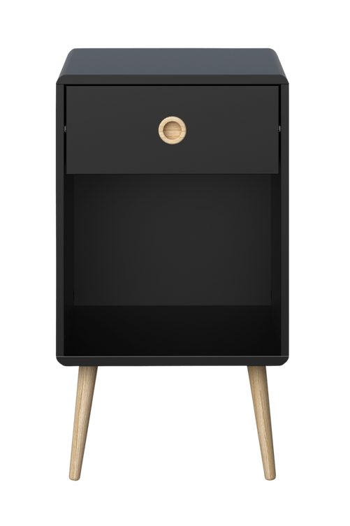 Nattbord med 1 låda och öppet utrymme för förvaring. Tillverkad i lackerad MDF och massiv ekhandtag och ben. Enkel självmontering.