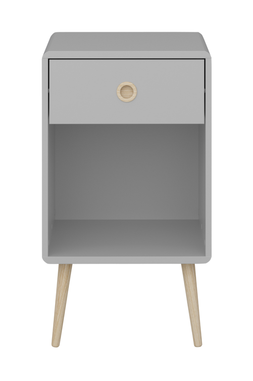 Nattbord med 1 låda och öppet utrymme för förvaring. Tillverkad i lackerad MDF och massiv ekhandtag och ben. Enkel självmontering.