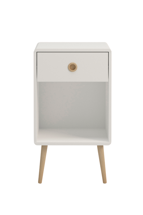 Nattbord med 1 låda och öppet utrymme för förvaring. Tillverkad i lackerad MDF och massiv ekhandtag och ben. Enkel självmontering.