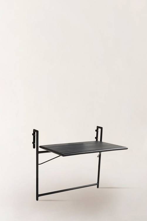 Balkongbord av pulverlackerad aluminium med matt yta som inte bländar i solskenet. Praktisk modell som du fäller upp när du behöver bordet, annars kan det hänga nedfällt utan att ta plats. NAVONA tål att hänga kvar utomhus på balkong- eller altanräcket. Du slipper bära så fort du vill sitta ute. Låg vikt. Material: Aluminium. Storlek: Höjd 15,5 cm, Bredd: 66 cm, Djup: 60 cm. Bordsskiva 39,3×60 cm. Passar räcke som är max 4,5 cm brett. Skötselråd: Torkas av med lätt fuktad trasa. Tips/råd: NAVONA är fint som litet blombord om du vill odla på balkongen.