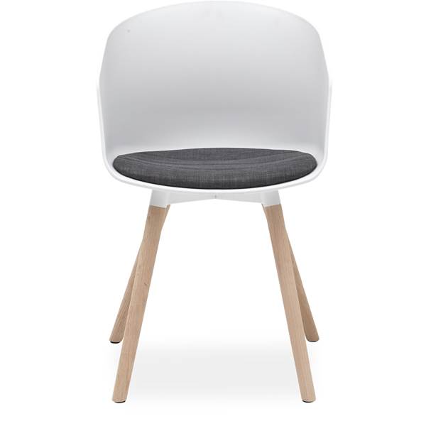 matstol, maxbelastning 110 kg och siddehøjde 46 cm. – Sittskal i formstöpt vit plast, kudde i grått tyg och ben i naturoljad massiv ek