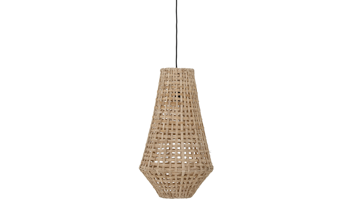 Nolie är en fin taklampa i avlång, geometrisk form. Lampan är tillverkad av barken från bananträd vilket för in en organisk och naturnära känsla i rummet. Skärmen har en flätad textur som gör att ljuset sprider sig och skapar ett elegant skuggmönster.Design & egenskaperTaklampa som skapar fina skuggfigurer.Tillverkad av bananfiber och järn.Textilsladd 2,5 m i svart med takkopp.Lamppropp med sladd ingår ej.E27. Max 40W. CE-märkt. Ljuskälla ingår ej.