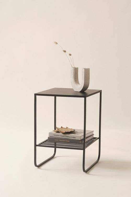 Sidobord av järn med mattlackerad yta. Bordet har en hylla under som ger praktisk förvaring. Det gör sig fint bredvid soffan i vardagsrummet men är också ett utmärkt sängbord. Stommen är av fyrkantsprofil och benen är dekorativa där de gör en rundad sväng så bordet står som på medar. Material: Järn. Storlek: Höjd 52 cm, bordsskiva 35,5×36 cm. Skötselråd: Torkas av med lätt fuktad trasa. Tips/råd: Placera en snygg korg på gallerhyllan som rymmer småsaker.
