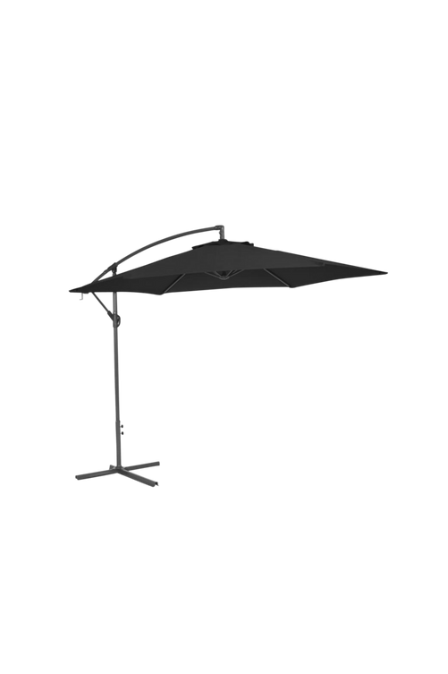 Hängparasoll med pulverlackerad aluminiumstolpe och pulverlackerade stålribbor. Med tiltfunktion och luftventil. Med vev för att öppna och stänga paraplyet. Tillverkad med en 180 g polyester. Levereras med X-fot men inte med plattor. Diameter 295 cm