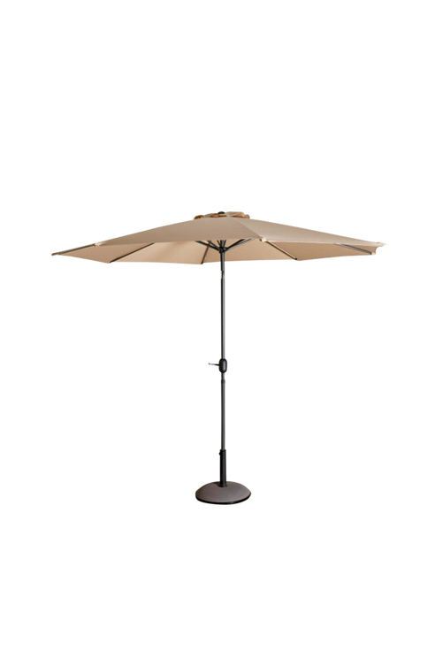 Parasoll med en pulverlackerad aluminiumstolpe och 8 stålribbor. Med vev och tiltfunktion. Tillverkad med en 180 g polyester. Levereras utan fot. Diameter 300 cm.