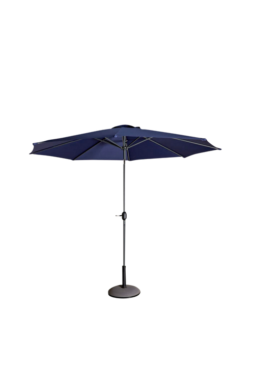 Parasoll med en pulverlackerad aluminiumstolpe och 8 stålribbor. Med vev och tiltfunktion. Tillverkad med en 180 g polyester. Levereras utan fot. Diameter 300 cm.
