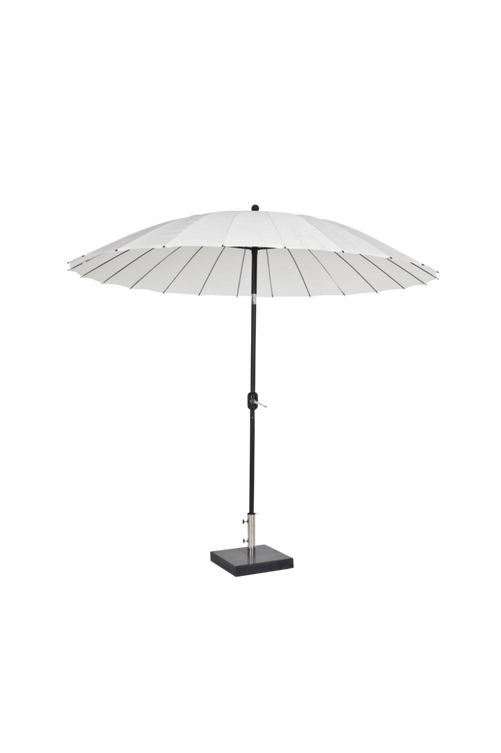 Parasoll med pulverlackerad aluminiumstolpe och stålribbor. Med vev och tiltfunktion. Tillverkad med en 160 g polyester. Levereras utan fot. Parasollets diameter 270 cm. Diameter på stången 3,8 cm.