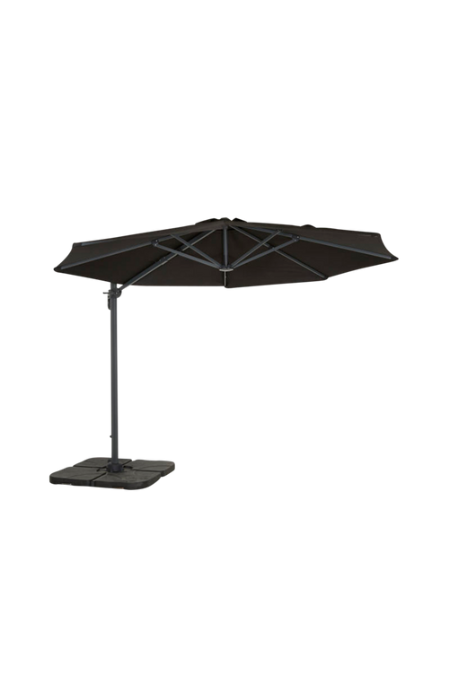 Hängparasoll med pulverlackerad aluminiumstolpe och aluminiumribbor. Med luftventil och vev för att öppna och stänga paraplyet. Med 360 graders justerbarhet. Tillverkad med en gråfärgad 240 g polyester och med PA-beläggning. Paraplyet levereras med en X-fot men inte med plattor. Diameter 300 cm